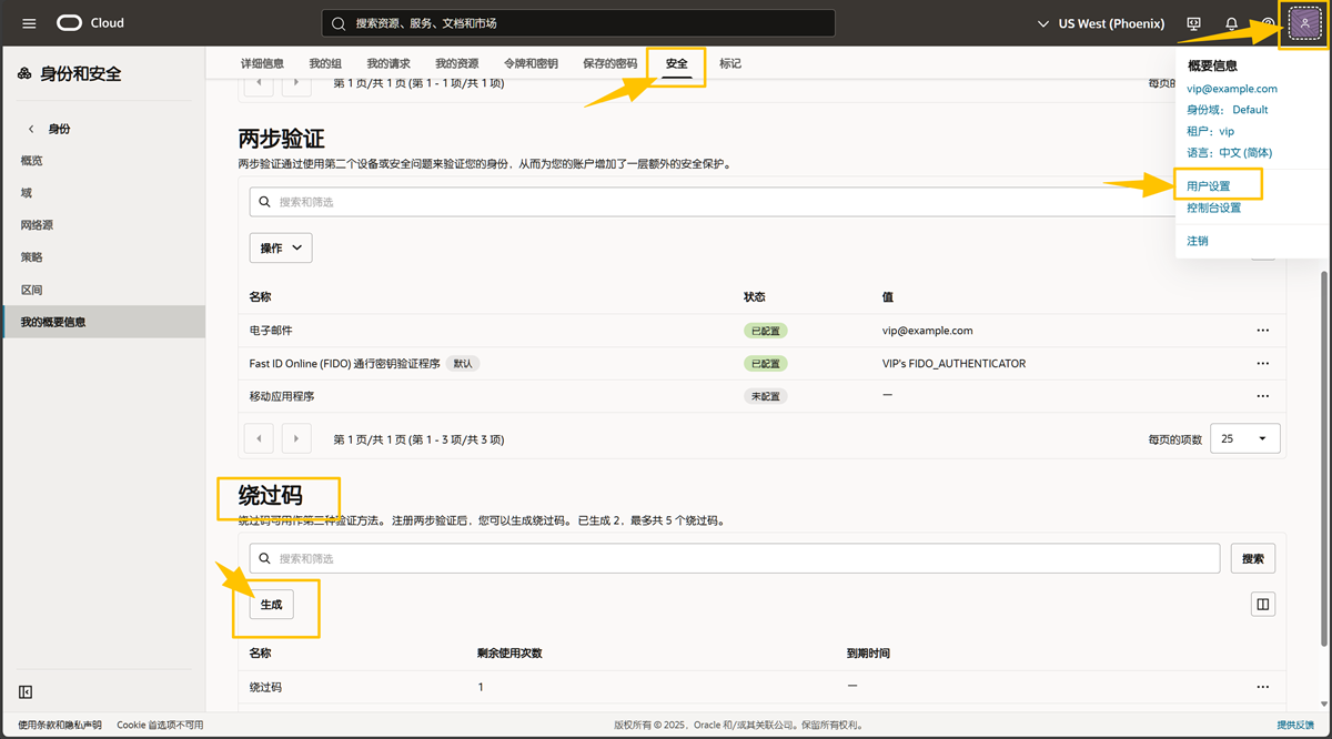 成功登录甲骨文云控制台后,点击右上角【个人图标】,进入【用户设置】,选择【安全】选项卡,将页面拉到最下面的【绕过码】标签,点击【生成】按钮即可生成1个绕过码,点击【复制】存档。