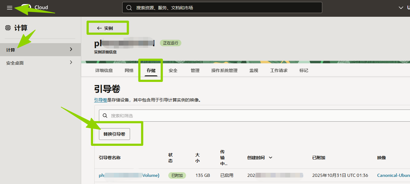成功登录甲骨文云控制台后,点击左上角图标【】,选择【计算】-【实例】,查看当前实例,选择需要重装系统的实例,选择【存储】选项卡,找到【引导卷】选项卡,点击【替换引导卷】按钮。