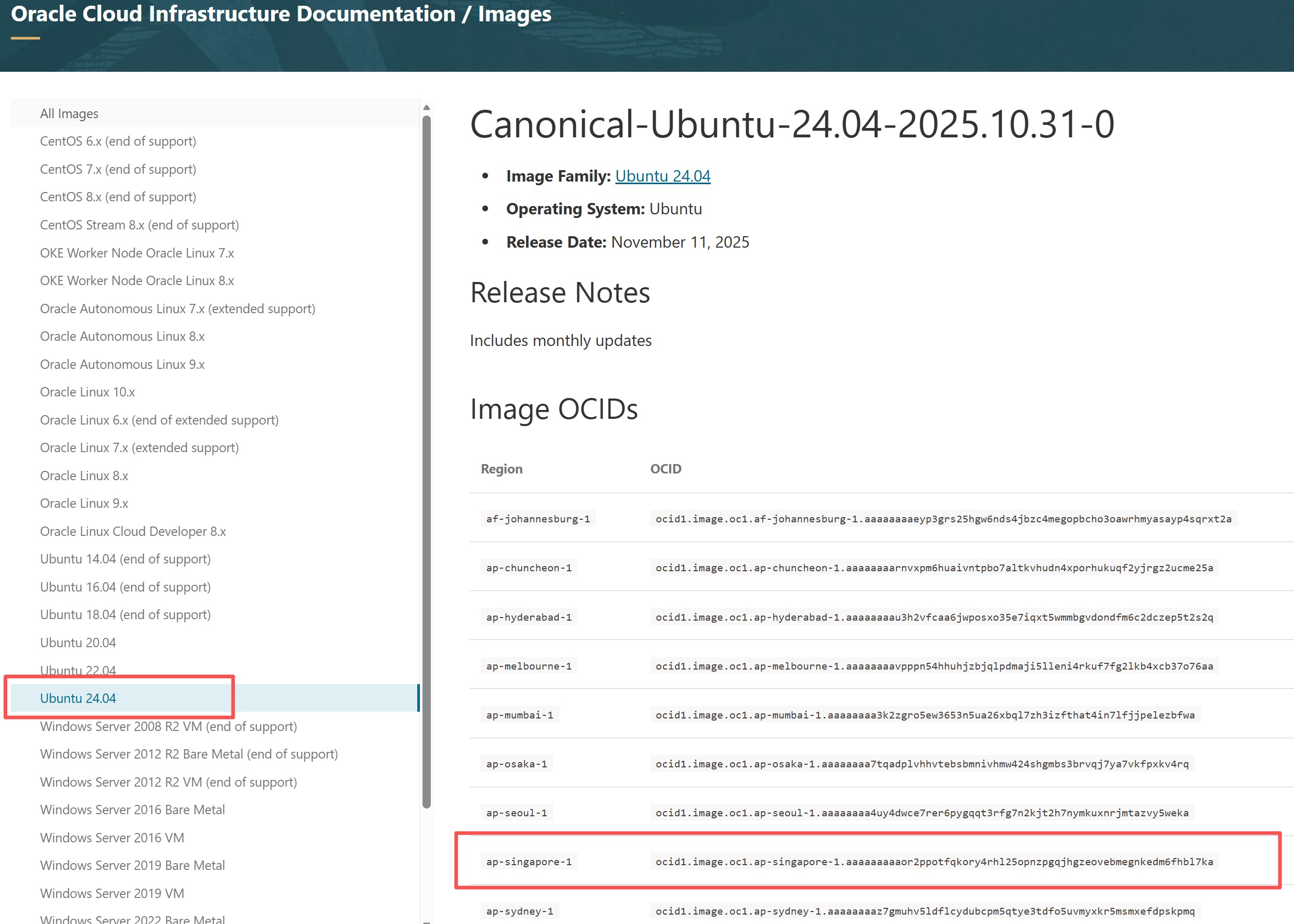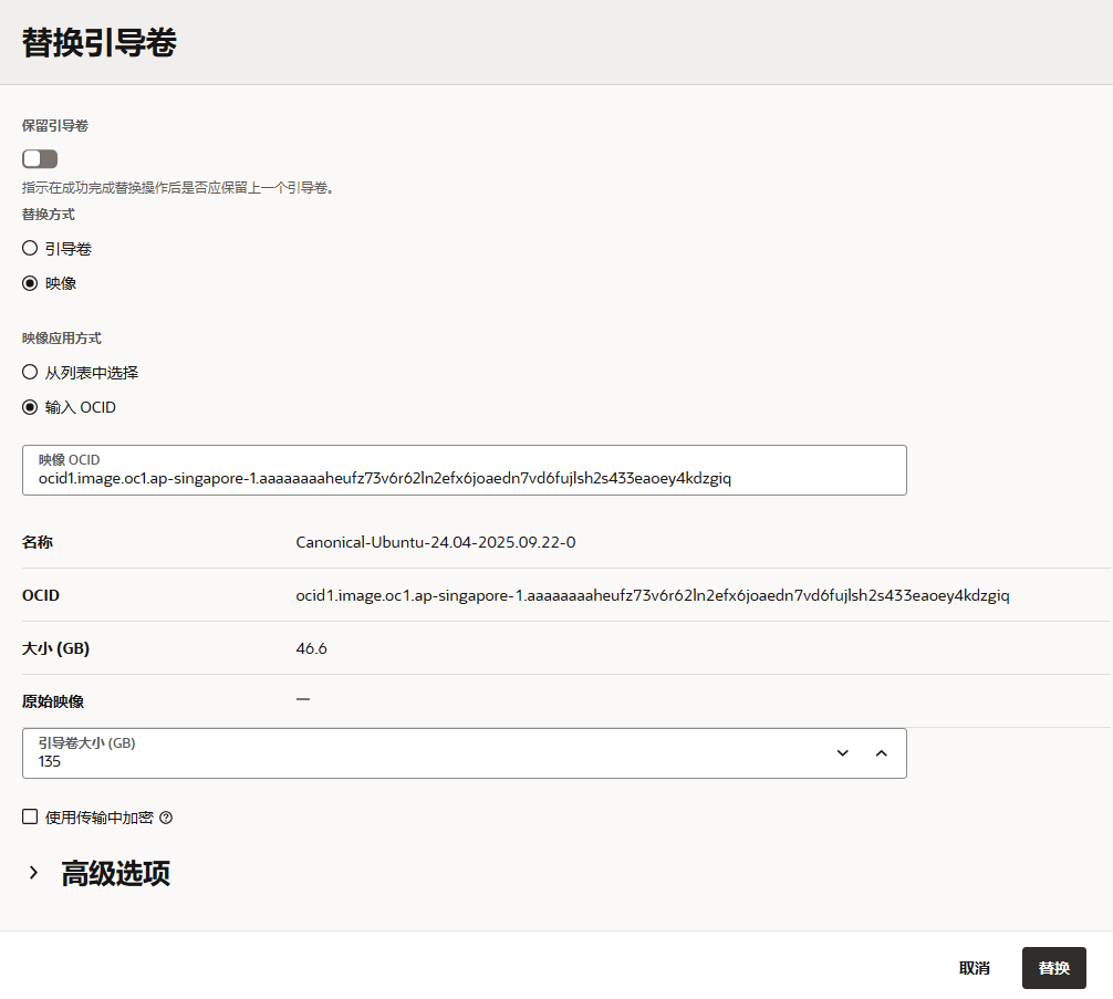 在【替换引导卷】操作界面,【替换方式】选择“映像”,【引导卷应用方式】选择“输入 OCID”,在下方的映像 OCID输入框输入你要重装的操作系统的OCID,甲骨文官方最新操作系统的映像OCID获取可以通过 https://docs.oracle.com/en-us/iaas/images/ 获取(如图:通过左边选择您要的操作系统,然后选择对应的版本,找到对应的区域,如我找的是Ubuntu 24.04的新加坡区域的,复制ICID)。