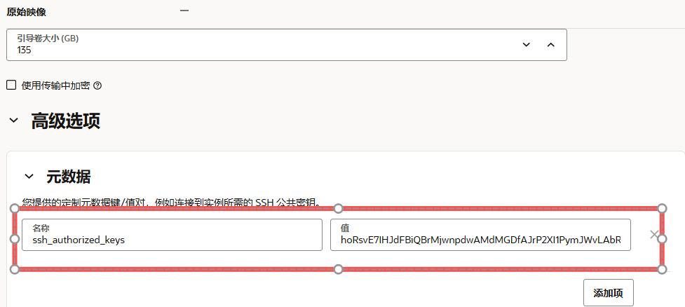 如果你还记得之前的系统的秘钥,则直接 【替换】 即可。 更换新的访问秘钥在 【替换引导卷】 中点击页面下方的 【高级选项】 ,点击 【元数据】 ,在 【名称】 处输入 ssh_authorized_keys ,【】 处输入新的 公钥。